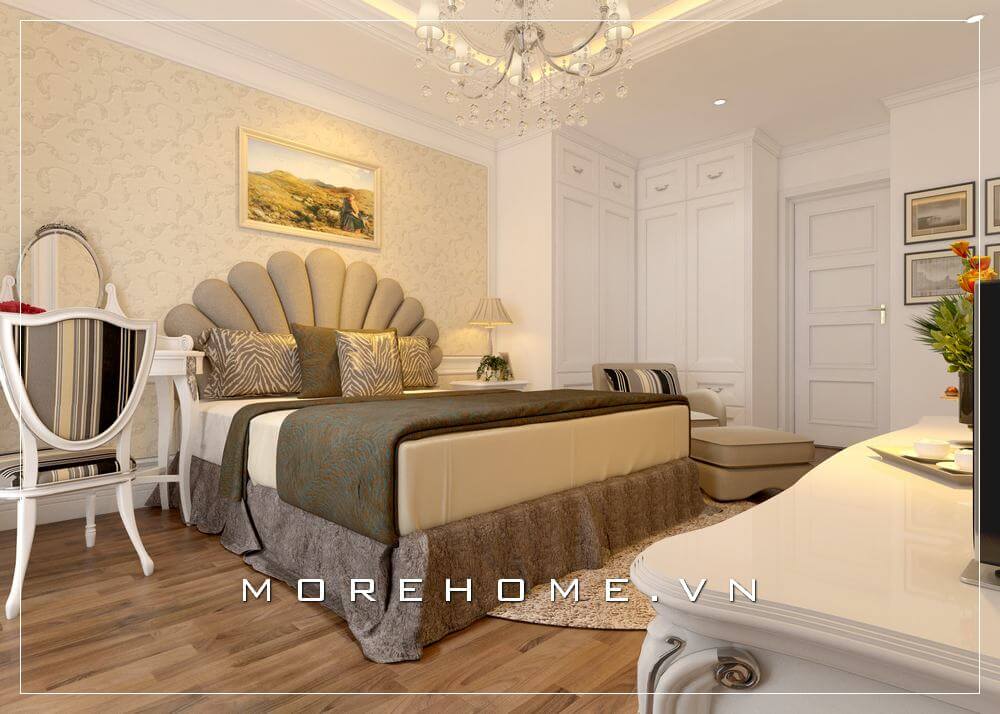 Thiết kế nội thất phòng ngủ chung cư cao cấp phong cách tân cổ điển, chiếc giường ngủ bọc da đầu giường cách điệu trở thành điểm nhấn ấn tượng cho cả không gian này