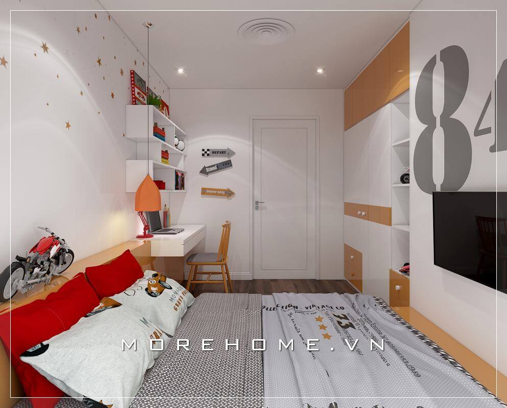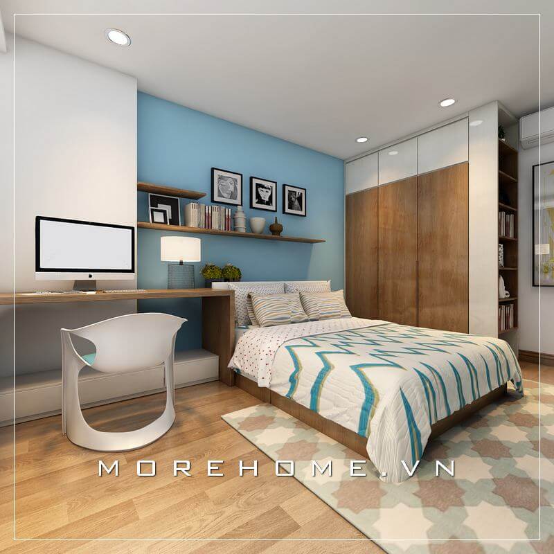 Bố trí nội thất phòng ngủ chung cư có ban công hiện đại, chiếc giường ngủ đơn được đặt cạnh bàn làm việc, tủ quần áo âm tường cửa lùa mang lại sự tiện nghi và thông thoáng nhất