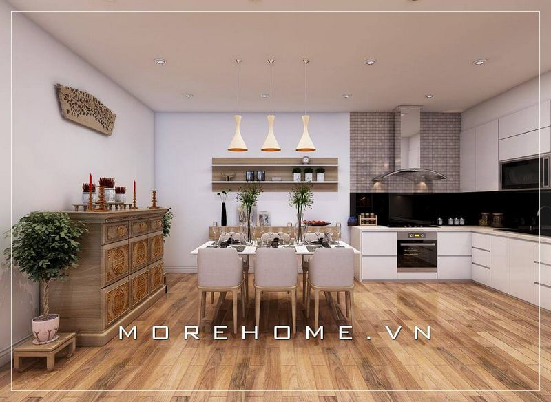 Thiết kế nội thất phòng bếp hiện đại bằng gỗ tone màu trắng sẽ tạo nên một không gian nấu nướng tiện nghi cho người nội trợ. Điều này sẽ làm ấn tượng mạnh mẽ với những ai đến thăm.