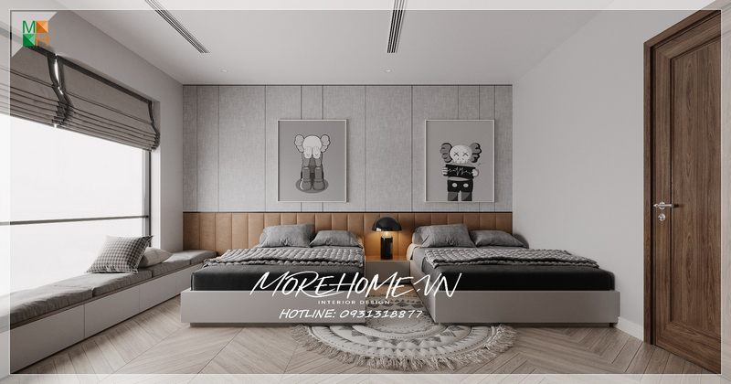 Để tạo ra một không gian nghỉ ngơi tốt nhất cho bé, việc sắp xếp nội thất cần được thực hiện hiệu quả. Hai chiếc giường có kích cỡ giống nhau và màu sắc trung tính sẽ là lựa chọn tốt nhất cho cặp sinh đôi bé trai và bé gái.